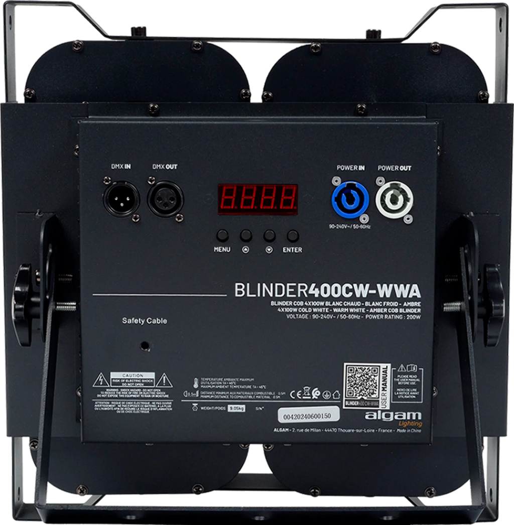 Looking for a powerful lighting system capable of creating that dazzling blinder effect on stage? The BLINDER 400 CW-WWA from Algam Lighting is the right choice for you! Designed around 4 powerful 100W COB LEDs, this impressive blinder can generate a palette of whites ranging from cool white to warm amber hues similar to traditional halogen lamps, thanks to a combination of cold white/warm white/amber COB LEDs. DMX controlled via 7 or 16 channels, the BLINDER 400 CW-WWA allows precise individual adjustment of the intensity and color of each LED, and offers different effects for greater versatility.