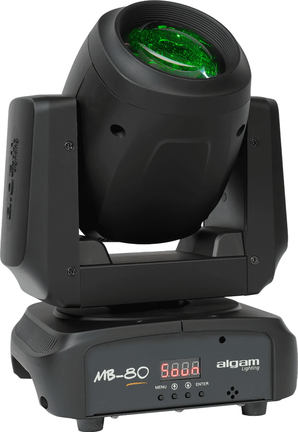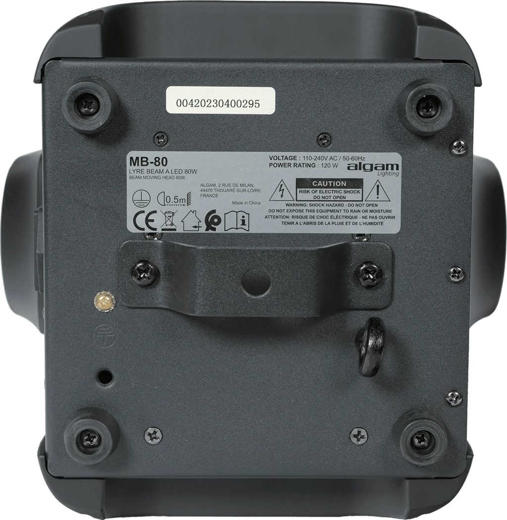 The MB80 is a beam projector with a highly powerful 80W white LED. Onboarding a wheel of 8 gobos with its 8-colour palette and a double rotating prism of 6 or 12 facets, this bluffing efficiency for its size projects light beams and patterns all as attractive as each other. Developed by a team of enthusiasts, the MB80 beam projector is compatible with a wide range of fixed or mobile applications. Its quiet motorization ensures smooth panning movements up to 540° and tilting up to 230° with a striking dynamism. DMX controllable through 11 or 13 channels for extended possibilities, or configurable via the integrated control panel, this moving head also operates in automatic, music-controlled or master/slave mode. Weighing only 3kg, the MB80 has a removable base plate system for safe head-down installations.