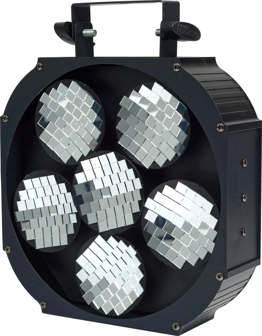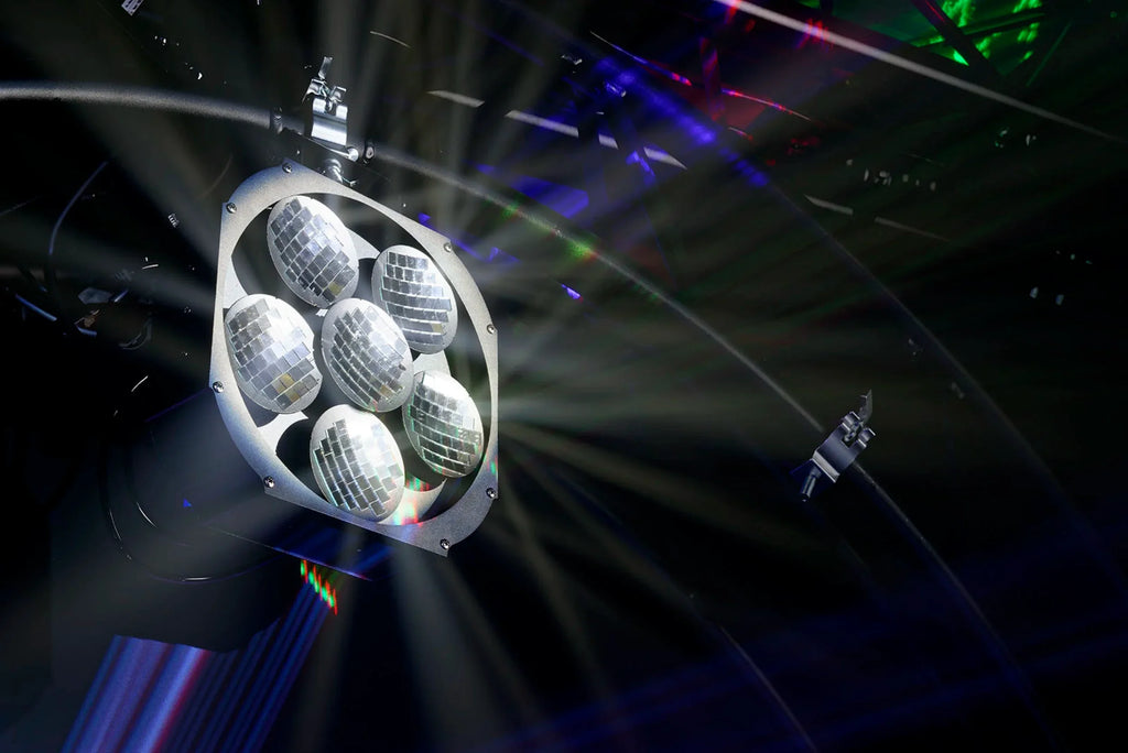 A must for every disco party and nightclub worthy of the name, the mirror ball is certainly the most emblematic effect of the 80s! With the Moving Mirror 6, Algam Lighting offers a revisited and modernized version of this famous effect. It consists of six motorized, curved rotating discs covered with a mirror mosaic, capable of operating at different speeds and in opposite directions.