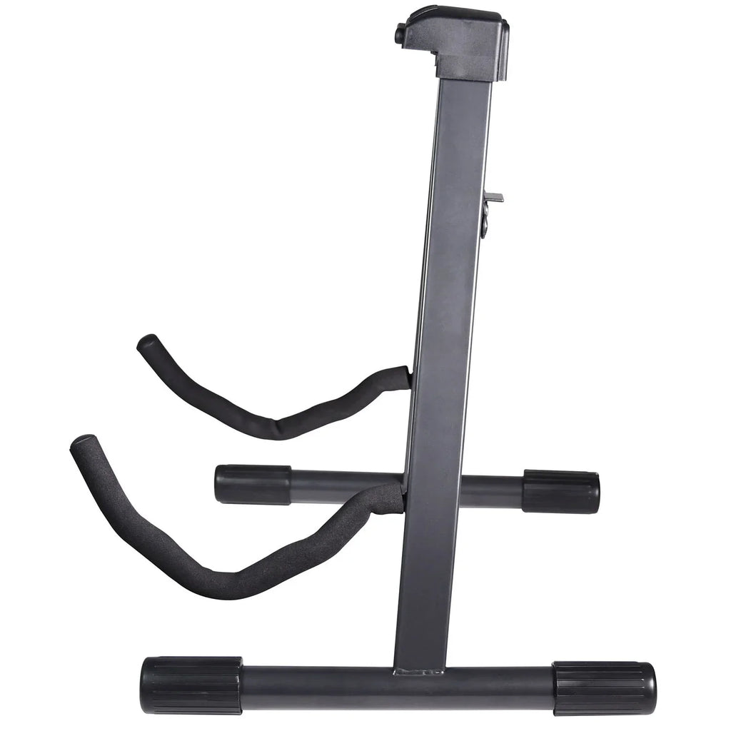 A foldable A-frame stand for acoustic, electric or bass guitars. Contoured forks hold either slim electric or deep acoustic guitar bodies in place, while supports avoid damage to the instrument.