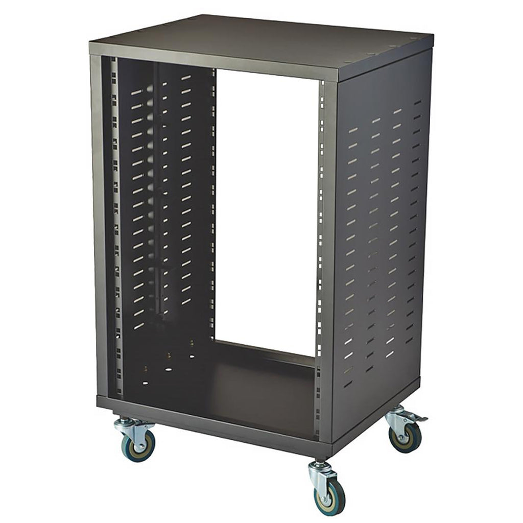 A light-duty durable open metal rack cabinet designed to mount 19" rack equipment such as amplifiers, mixers, effects units, media players, networking systems and more. It is delivered with a set of wheels and designed to be open at both sides - the front and the back. Suitable for office or undercounter use where the unit can be pulled out for easy access of the mounted equipments rear connections is required. The unit is delivered flat-packed.