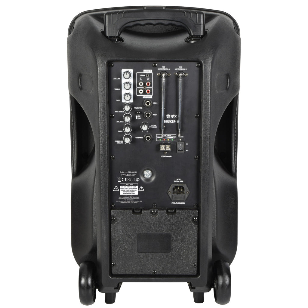 Complete portable PA unit in a sturdy cabinet with front mounted control panel. The built-in amplifier operates from mains or internal rechargeable battery to power a main driver and compression driven horn unit. Handheld VHF microphones are included (1 for Busker-10 or 2 for Busker-12/15) with 2 further wired mic inputs at the rear, auxiliary line input, musical instrument input and B/T wireless receiver. Internal audio source is provided by an integral USB/SD/FM media player. The cabinet is fitted with a carrying handle and 35mm pole mount and a retractable trolley handle and rear wheels provide easy portability.